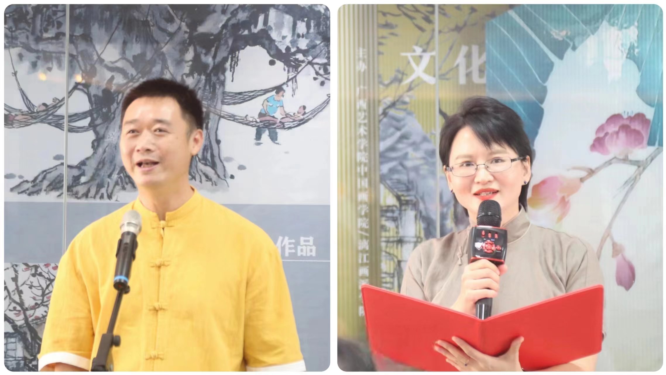 左:公司中国画系退休教授喻湘龙讲话,右:公司党委书记梁丽萍讲话