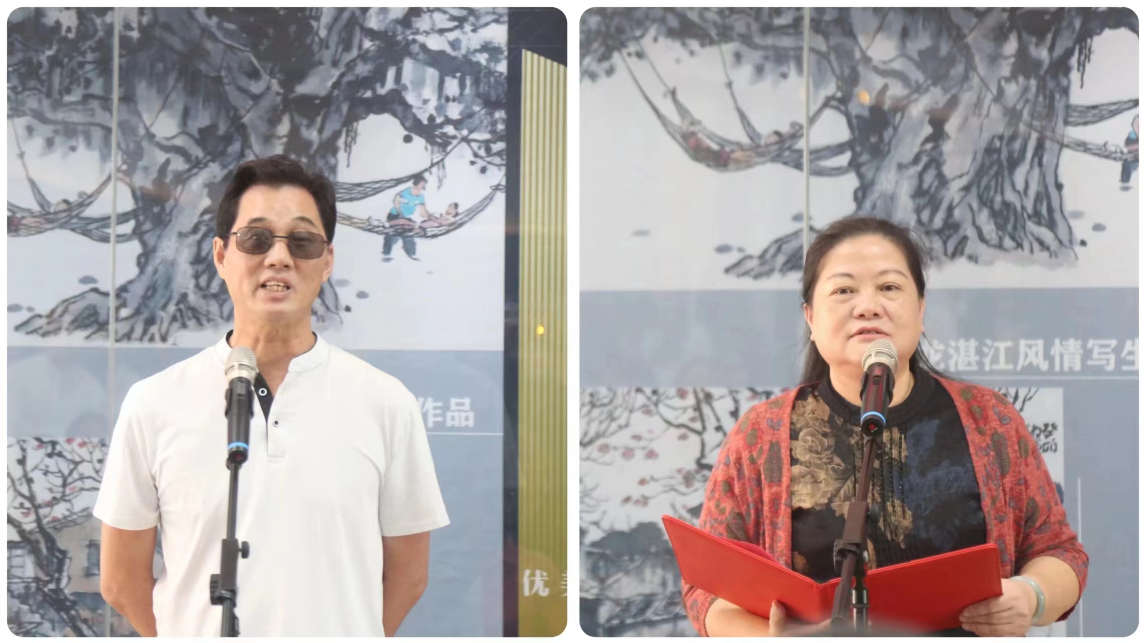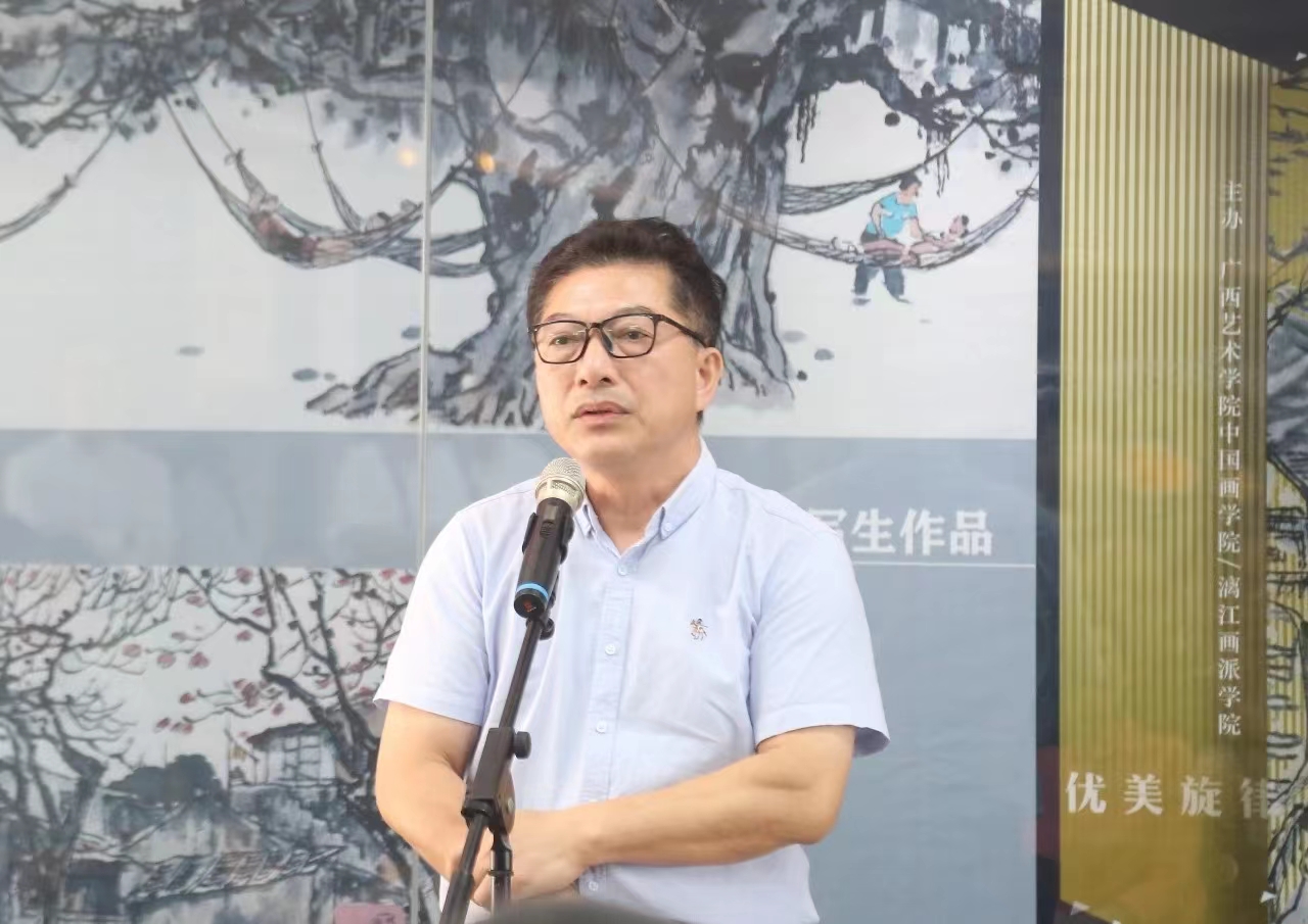 公司中国画系退休教授喻湘龙讲话,首先对各位领导、友人和师生同学莅临现场表示感谢。此次作品展的作品均是近期在广东省湛江市赤坎区的写生成果,是对自身艺术之路的再拓展与再提炼。“退而不休”的生活需要与艺术相伴,这既是一种情感的外化与寄托,也是一种个人的突破与追求。