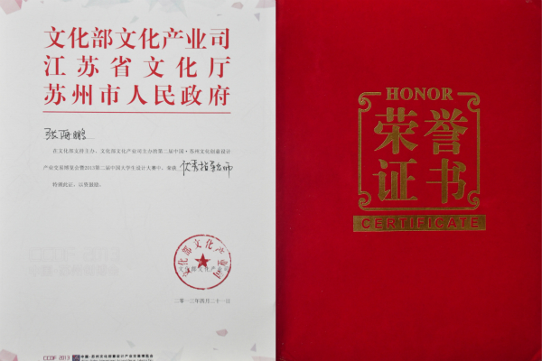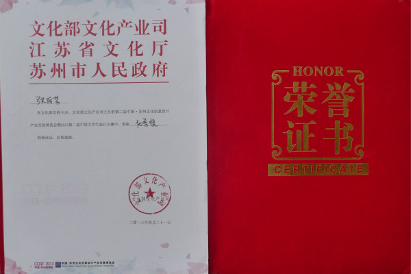 在文化部支持主办、文化部文化产业司主办的第二届中国苏州文化创意设计产业交易博览会暨2013第二届中国老员工设计大赛中,公司2010级中国民艺设计应用专业方向的张丽芳同学的参赛作品《俏江南 ——中式落地灯》荣获“优秀奖”,作品指导老师张海鹏老师荣获 “优秀指导老师奖”。