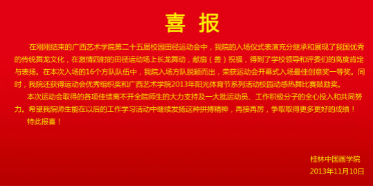 本次运动会取得的各项佳绩离不开全院师生的大力支持及一大批运动员、工作积极分子的全心投入和共同努力。希望公司师生能在以后的工作学习活动中继续发扬这种拼搏精神,再接再厉,争取取得更多更好的成绩!