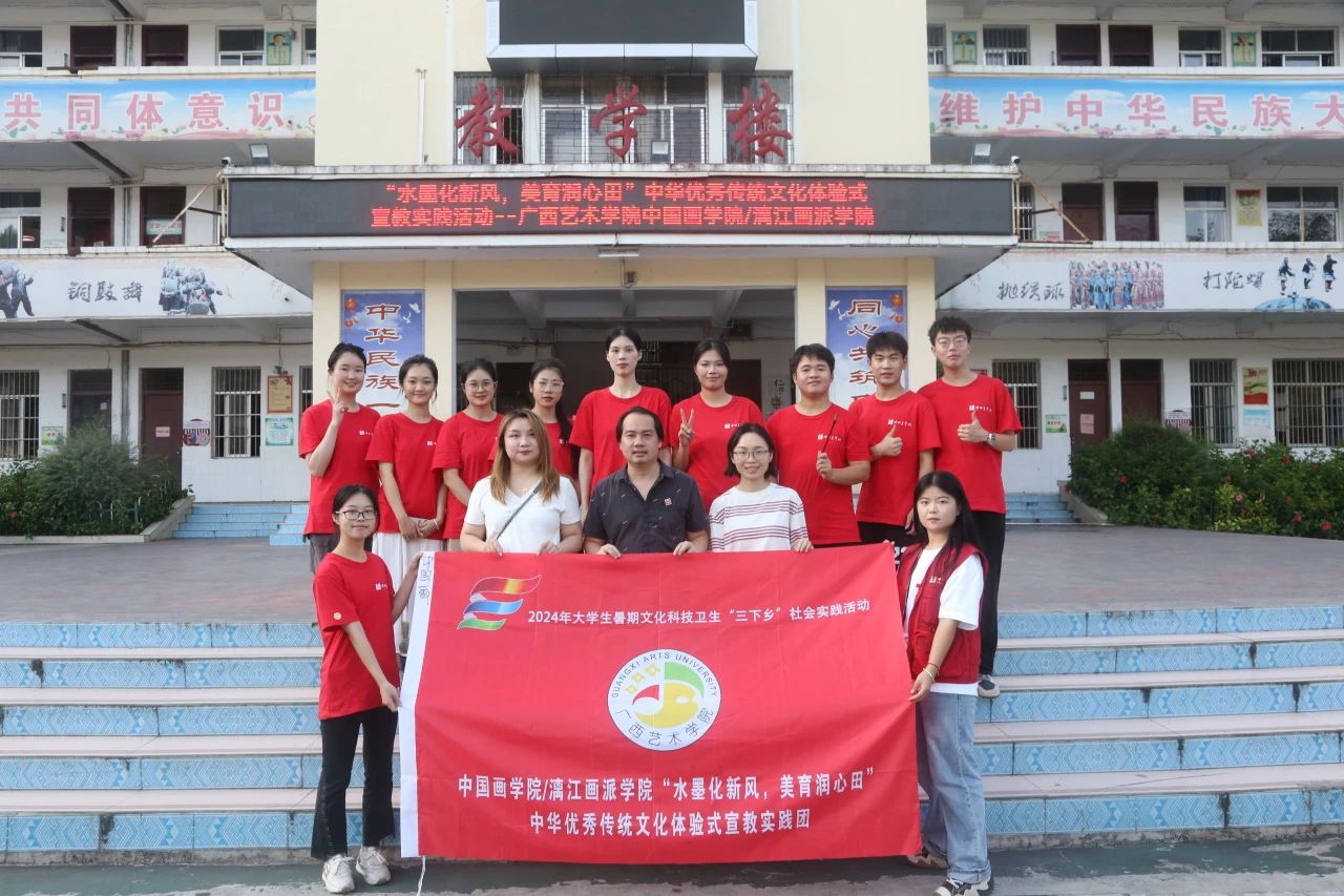 公司实践团24名师生先后于6月、7月中旬前往河池市巴马瑶族自治县第三中学和第五小学开展2024年暑期“三下乡”社会实践活动。实践团师生通过美育讲座、书画支教、现场笔会、书画作品展、爱国主义教育宣讲及考察调研红色基地等方式展开实践,活动得到自治区党委教育工委宣传部部长、教育厅思政处处长、二级巡视员赵益真及巴马瑶族自治县教育局梁高局长现场指导,受到当地师生群众热烈欢迎。