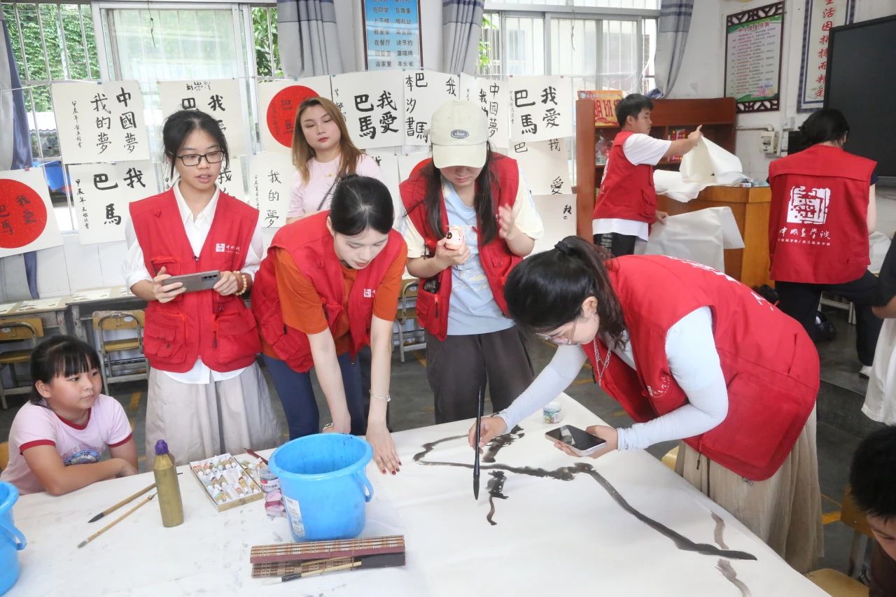 7月17日,实践团师生在巴马瑶族自治县第五小学开展笔会,吸引160余名师生家长到场交流互动、学习观摩。在场师生手执毛笔共同绘就美育“同心圆”,协力架起互助“连心桥”。最后,实践团师生将笔会作品赠予巴马瑶族自治县第五小学。